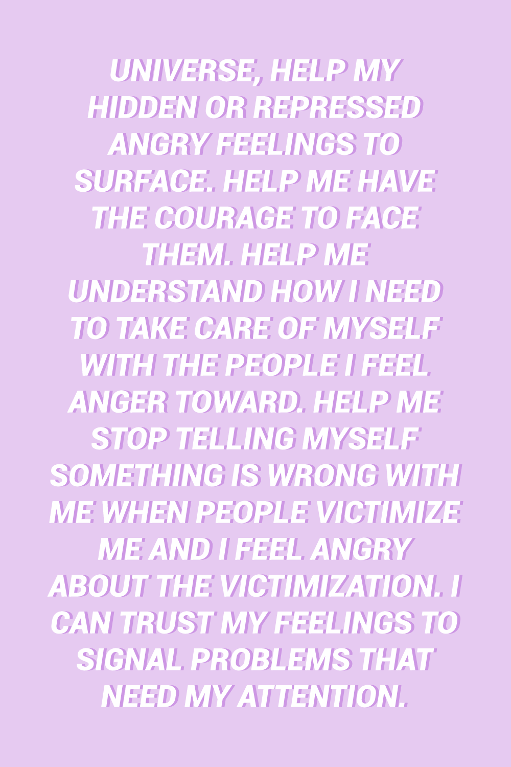“Universe, help my hidden or repressed angry feelings to surface. Help me have the courage to face them. Help me understand how I need to take care of myself with the people I feel anger toward. help me stop telling myself something is wrong with me when people victimize me and I feel angry about the victimization. I can trust my feelings to signal problems that need my attention.”