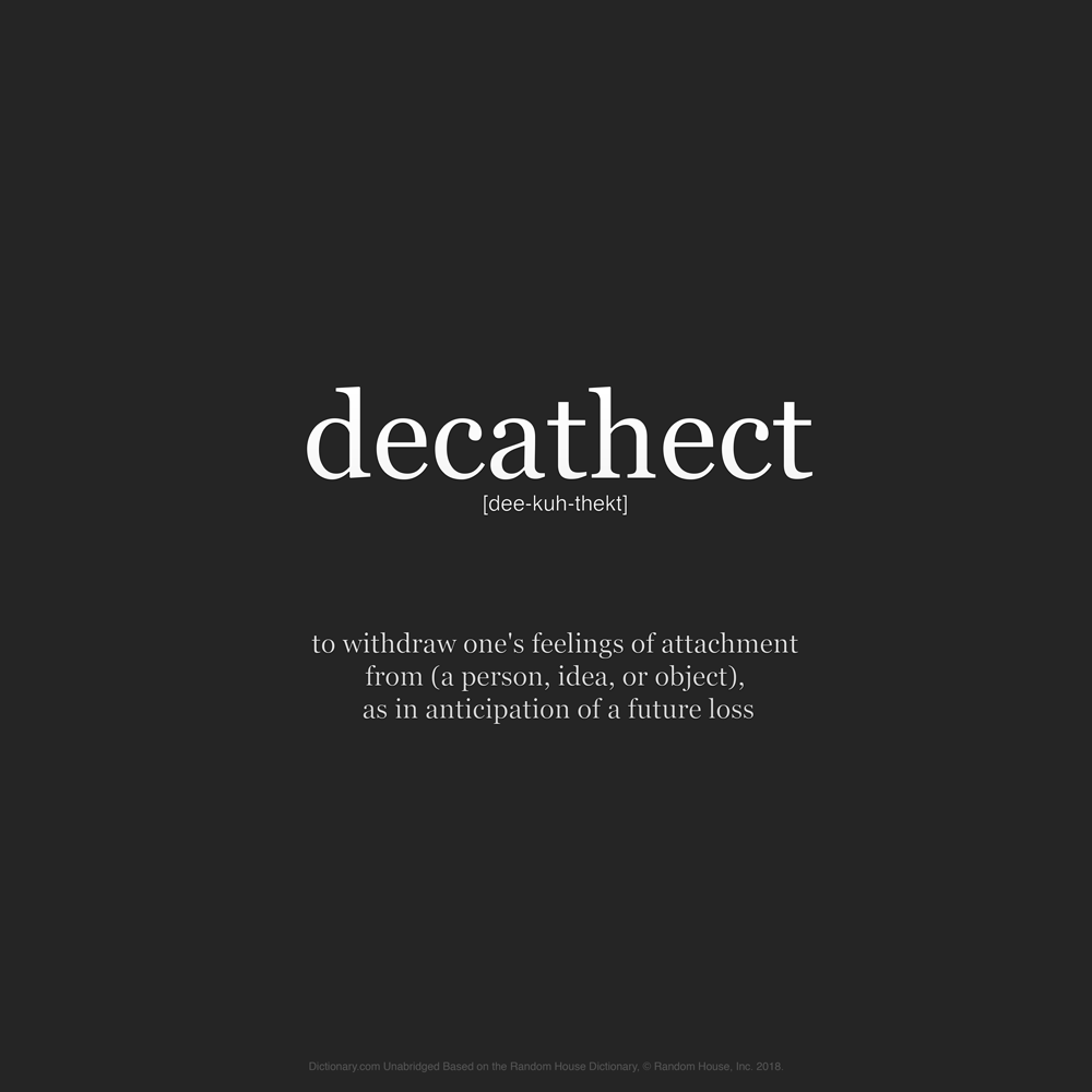 - to withdraw one’s feelings of attachment from (a person, idea, or object), as in anticipation of a future loss: He decathected from her in order to cope with her impending death.