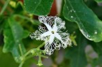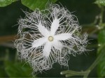Snake Gourd (Trichosanthes cucumerina var. Anguina) is a beautiful white and strongly scented flower, fringed with long, lace-like tendrils. It opens in the evening or in the early morning, so the plant can be pollinated by moths. It is a member of the pumpkin family. The shoots, tendrils, and leaves of the plant are also eaten as greens. With some cultivars, the immature fruit has an unpleasant odor and a slightly bitter taste, both of which disappear in cooking. (Source)