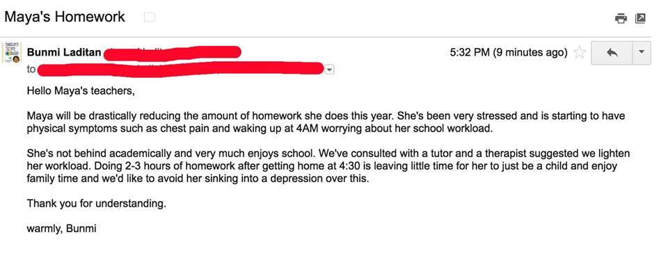 Maya will be drastically reducing the amount of homework she does this year. She’s been very stressed and is starting to have physical symptoms such as chest pain and waking up at 4 a.m. worrying about her school workload.